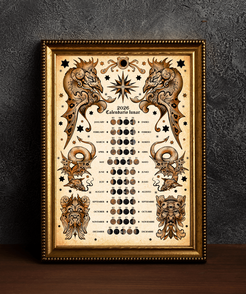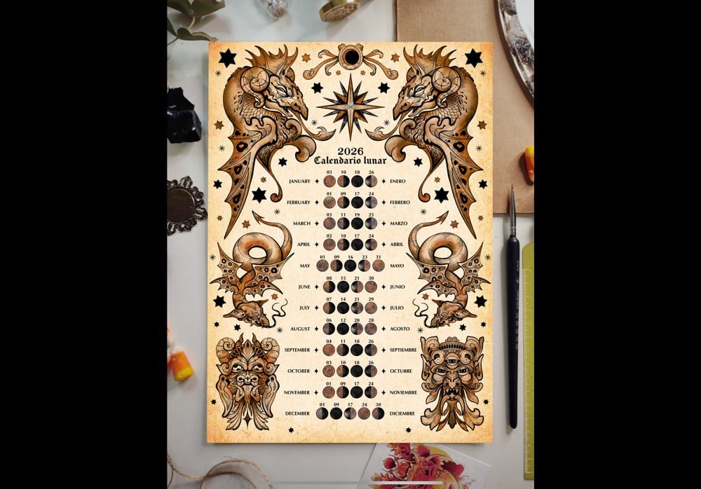 Reserva tu calendario lunar 2026 ilustrado y elige tu formato favorito: A3 o A4.